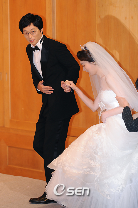 개그맨이자 MC인 유재석(36)이 6일 오후 1시 서울 중구 신라호텔에서 교제 사실을 밝혀온 MBC 아나운서 나경은(27)과 비공개로 결혼식을 올린다. 사회는 유재석의 절친한 친구인 이휘재, 주례는 MBC 아나운서 출신의 변웅전 국회의원이 맡으며 가수 김종국과 개그우먼 송은이가 축가를 부른다. 결혼식에 앞서 유재석과 나경은이 기자회견장에 들어서고 있다./ 민경훈 기자rumi@osen.co.kr