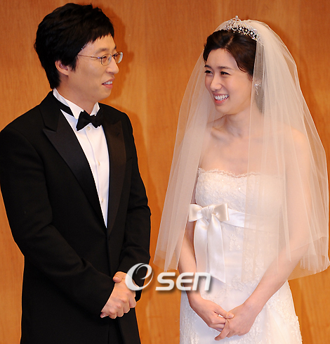 개그맨이자 MC인 유재석(36)이 6일 오후 1시 서울 중구 신라호텔에서 교제 사실을 밝혀온 MBC 아나운서 나경은(27)과 비공개로 결혼식을 올린다. 사회는 유재석의 절친한 친구인 이휘재, 주례는 MBC 아나운서 출신의 변웅전 국회의원이 맡으며 가수 김종국과 개그우먼 송은이가 축가를 부른다. 결혼식에 앞선 기자회견에서 나경은이 유재석을 보고 미소짓고 있다. /민경훈 기자 rumi@osen.co.kr