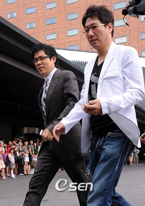 개그맨이자 MC인 유재석(36)이 6일 오후 1시 서울 중구 신라호텔에서 교제 사실을 밝혀온 MBC 아나운서 나경은(27)과 비공개로 결혼식을 올린다. 사회는 유재석의 절친한 친구인 이휘재,주례는 MBC 아나운서 출신의 변웅전 국회의원이 맡으며 가수 김종국과 개그우먼 송은이가 축가를 부른다. 유재석 나경은 결혼을 축하하기 위해 참석한 김용만 지석진이 결혼식장에 들어서고 있다./윤민호 기자 ymh@osen.co.kr