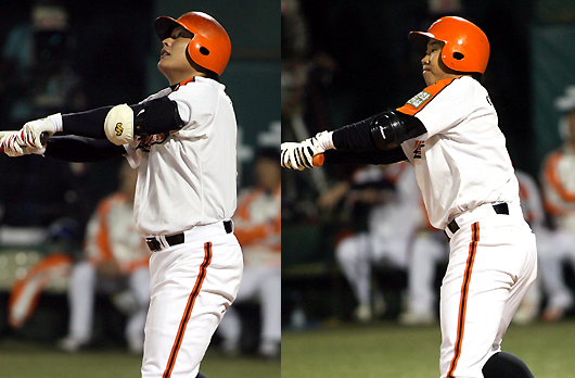 [OSEN=대전, 이상학 객원기자] 백투백 전문듀오. ‘한화 타선의 힘’ 김태균(26)-이범호(27)가 시즌 4번째 백투백 홈런을 기록했다. 김태균과 이범호는 6일 대전구장에서 열린 SK와의 홈경기에서 6회말 나란히 솔로포로 백투백 홈런을 작렬시켰다. 이날 잠실구장에서 우리 히어로즈를 상대로 1회말 두산의 김동주-홍성흔 듀오가 시즌 3번째 백투백 홈런을 터뜨리며 김태균-이범호 듀오와 동률을 이루자 곧바로 달아나는 시즌 4번째 백투백 홈런을 터졌다. 김태균-이범호 듀오의 시즌 첫 백투백 홈런은 지난 5월30일 청주 LG전에서 터졌다. 2회말 4번 김태균이 중월 솔로포를 터뜨리자 5번 이범호가 좌월 솔로포로 화답했다. 이어 지난달 12일 대구 삼성전에서 1회초 김태균이 좌월 스리런 홈런을 터뜨린 뒤 5번 이범호가 우월 솔로포를 때리며 기선제압에 성공했다. 지난 2일 대전 두산전에서는 3번 이범호가 좌월 투런포를 터뜨린 후 4번 김태균이 중월 솔로포로 꽃길을 따라갔다. 이날 경기에서는 4번 김태균-5번 이범호 듀오가 합창했다. 6회말 선두타자로 등장한 김태균은 SK 선발 케니 레이번의 바깥쪽 높은 141km 직구를 걷어올려 가운데 담장을 넘어가는 비거리 120m 시즌 23호 홈런을 터뜨렸다. 7월에만 4홈런을 터뜨리며 이 부문 1위를 말 그대로 질주하고 있다. 이어 들어선 이범호도 레이번의 가운데 높은 141km 직구를 받아쳐 역시 가운데 백스크린을 맞히는 비거리 120m 솔로포를 작렬시며 레이번을 마운드에서 끌어내렸다. 시즌 13호 홈런. 올 시즌 프로야구에서 백투백 홈런을 총 15차례 나왔다. 이 가운데 김태균-이범호 듀오가 4개를 터뜨렸고, 지난달 21일 목동 히어로즈전에서는 이범호-김태완 듀오가 백투백을 날린 바 있다. 올 시즌 15차례 백투백 홈런 중 5차례를 한화가 책임졌다. 김동주-홍성흔 듀오가 3차례 백투백을 기록한 두산이 총 4차례로 그 뒤를 따르고 있다. 이어 롯데와 히어로즈가 나란히 2차례를 기록했고, SK와 KIA가 1차례씩 백투백 홈런을 터뜨렸다. 삼성과 LG는 올 시즌 백투백 홈런이 한 차례도 없었다. . . . . .