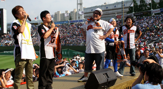 SBS 개그 프로그램 웃음을 찾는 사람들(웃찾사) 개그맨 4인방 김병달, 이동엽, 박영재, 김대호가 롯데 자이언츠의 선전을 위한 도우미로 나선다. 지난 6일 사직 LG전이 열리기 전 1루 응원단상에서 롯데 팬들과 함께 응원가를 부르며 거인 군단의 승리를 기원했다. 웃찾사 4인방은 이대호(26), 이승화(26), 장원준(23), 이원석(22)과 '함보자'라는 친목 모임을 결성, 남다른 우정을 과시했다. '함보자'는 경상도 사투리로 '또 만나자', '한 번 만나자'는 의미로 바쁜 일상 속에서 서로에게 힘이 되는 사이가 되자는 뜻에서 '함보자'를 결성했다. '함보자' 회장직은 김병달, 부회장직은 이동엽과 이대호가 맡는다. 한편 웃찾사 4인방은 틈나는대로 사직구장을 찾아 롯데의 승리를 위해 박수를 아끼지 않을 예정. 또한 부산지역 어린이재단과 함께 나눔의 즐거움을 선사할 계획이다. what@osen.co.kr . . . . . 이피플코리아 제공.