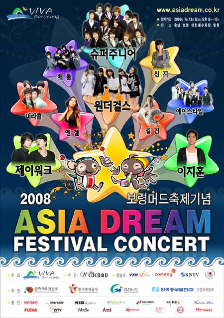 충남 보령시와 아시아드림페스티벌이 손을 잡았다. 오는 13일 ‘제 1회 아시아드림페스티벌’을 보령 대천해수욕장에서 열기로 했다. 충남 보령시의 보령머드축제위원단은 ‘제 11회 보령머드축제’의 국제화를 위한 프로젝트의 일환으로 ‘아시아드림페스티벌’을 기획, 운영하기로 했다. ‘아시아드림페스티벌’은 보령머드축제를 전 세계에 알리기 위해 한국 중국 일본에서 온 12개의 스타팀-한국의 슈퍼쥬니어, 원더걸스, 이지훈, 제이워크, 일본의 엔카 가수 토바 이치로 등-을 무대에 끌어 모았다. 오는 13일 저녁 8시 보령시 대천해수욕장 일원에서 2시간 동안 이들이 펼치는 무대가 만들어진다. 이번 ‘아시아드림페스티벌’은 종전 지방자치단체가 독자적으로 운영하는 방식과 달리 보령시와 민간 사업자가 공동으로 기획하여 운영하는 새로운 형식의 사업이다. 100c@osen.co.kr