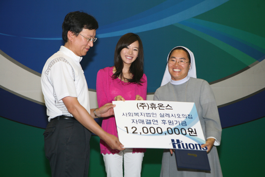 ‘기부천사’ 김다은이 장애인 시설 돕기에 나서 변함없이 이웃 사랑을 실천하고 있다. 김다은은 최근, 지적장애인들에게 일상 생활 훈련이나 직업재활 의료치료 등을 하며 장애인의 사회 통합화와 복지 증진에 힘쓰고 있는 충북 제천의 살레시오의 집을 방문해 휴온스의 윤성태 대표와 함께 1200만 원을 기부했다. 이미 김다은은 중국 수지운 화장품 모델료 전액을 중국 산동성의 한 초등학교에 기부한 바 있고 지난 쓰촨성 지진에도 성금을 내 민간 외교관 구실을 톡톡히 했다. 김다은은 “휴온스가 사회를 위해 좋은 일을 많이 한다고 들었고 작은 금액이라도 함께 하길 바랐는데 이렇게 참여하게 되어 기쁘다. 앞으로도 조그마한 저의 힘이지만 좋은 일이 있다면 더 많이 참여하고 싶다”고 소감을 밝혔다. 김다은은 휴온스의 복부비만 치료제 살사라진의 대표 모델로 활동 중이다. 100c@osen.co.kr 휴온스 관계자와 함께 후원기금을 전달하고 있는 김다은(가운데).