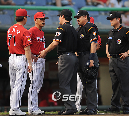 '2008 삼성 PAVV 프로야구' SK 와이번스와 KIA 타이거즈의 경기가 11일 인천 문학구장에서 벌어졌다. 4회말 1사 3루 SK 김재현 타석에서 KIA 선발 디아즈가 김재현의 등 뒤로 폭투를 던지는 사이 3루 주자 정근우가 홈으로 파고 들었다. 그러자 KIA 조범현 감독은 폭투가 아니라 김재현의 몸에 맞지 않았느냐며 심판진에게 강력하게 어필하고 있다. /인천=민경훈 기자rumi@osen.co.kr