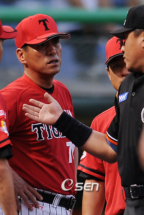 '2008 삼성 PAVV 프로야구' SK 와이번스와 KIA 타이거즈의 경기가 11일 인천 문학구장에서 벌어졌다. 4회말 1사 3루 SK 김재현 타석에서 KIA 선발 디아즈가 김재현의 등 뒤로 폭투를 던지는 사이 3루 주자 정근우가 홈으로 파고 들었다. 그러자 KIA 조범현 감독은 폭투가 아니라 김재현의 몸에 맞지 않았느냐며 오석환 구심에게 항의를 하고 있다./인천=민경훈 기자rumi@osen.co.kr
