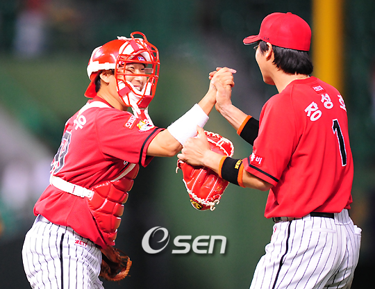 '2008 삼성 PAVV 프로야구' SK 와이번스와 KIA 타이거즈의 경기가 11일 인천 문학구장에서 벌어졌다. 이 날 KIA는 9회초 이현곤의 동점타와 김형철의 역전타로 2득점하며 승부를 뒤집어 2-1의 짜릿한 역전승에 성공했다. 경기를 마치고 KIA 이성우 포수와 장성호가 하이파이브를 하며 승리를 기뻐하고 있다./인천=민경훈 기자rumi@osen.co.kr