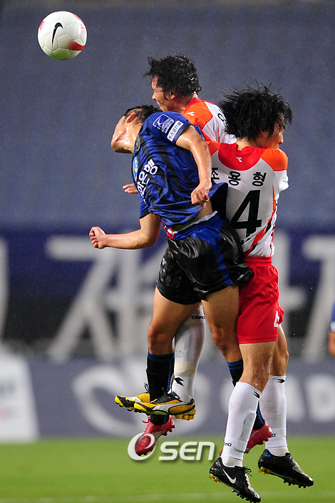 인천 유나이티드가 한 명이 퇴장당한 제주 유나이티드와 득점없이 비겼다. 12일 인천 문학월드컵경기장에서 열린 삼성 하우젠 K리그 2008 14라운드 인천과 제주의 경기는 0-0으로 무승부를 기록했다. 인천은 홈 연승 행진이 저지됐고 제주는 정규리그 4연승에 제동이 걸리며 주춤했다. 장대비가 쏟아지는 가운데 열린 인천과 제주의 경기는 초반부터 컴팩트한 패스 연결을 통해 강한 미드필드 압박을 시도한 제주가 경기의 주도권을 움켜쥐었다. 제주는 전방위적으로 움직이던 호물로가 문전의 조진주와 최현연에 날카로운 패스를 연결했지만 인천 수비에 막혀 제대로 슈팅을 시도하지 못했다. 중원 허리싸움서 밀린 인천은 제주에 주도권을 내준 채 라돈치치를 내세워 역습을 노렸다. 측면 공격수들의 움직임이 흔들려 어려움을 겪은 인천은 중거리 슈팅을 시도했지만 제주 골키퍼 조준호의 선방에 막혀 어려움이 따랐다. 제주는 전반 막판 호물로와 이정호가 날카로운 슈팅을 시도했지만 연달아 골문을 벗어나며 전반을 득점없이 마무리했다. 인천은 후반 시작 후 볼 점유율을 높여가며 반격에 나섰다. 인천은 후반 8분 제주 아크 정면에서 얻은 프리킥 찬스서 라돈치치의 슈팅이 골대를 벗어나며 기회를 살리지 못했다. 제주는 이어진 역습서 중거리 슈팅에 이은 조형재의 슈팅이 인천의 골망을 흔들었지만 오프사이드 판정으로 무효가 됐다. 이 때 거칠게 항의하던 조형재는 첫 번째 옐로카드를 받은 뒤 이어진 공격 상황서 다시 심판에 항의하다 또 옐로카드를 받고 퇴장을 당했다. 인천은 수적 우세를 통해 제주를 압도했다. 하지만 인천의 공격은 번번이 제주의 수비에 막혀 어려움을 겪으며 득점 찬스를 살리지 못했다. 인천은 후반 17분 여승원의 슈팅이 골키퍼 선방에 막히는 등 어려운 경기운영을 펼쳤다. 제주는 한 명이 퇴장 당한 가운데 빠른 움직임을 통해 후반 28분 조진수가 회심의 슈팅을 시도했지만 골키퍼 선방에 걸렸다. 인천은 후반 29분 라돈치치 대신 박재현을 투입해 득점을 노렸다. 하지만 인천의 공격은 번번이 제주의 수비에 막혔고 반격을 허용하는 등 우세를 보이지 못했다. 반면 제주는 수비 안정화를 꾀한 뒤 역습을 통해 수 차례 인천의 골문을 위협했지만 득점을 올리지 못하며 무승부를 기록했다. ■ 12일 전적 ▲ 인천 문학경기장 인천 유나이티드 0 (0-0 0-0) 0 제주 유나이티드 10bird@osen.co.kr 전반 제주 조용형 이정호와 인천 방승환이 공중볼 다툼을 벌이고 있다./인천=민경훈 기자 rumi@osen.co.kr