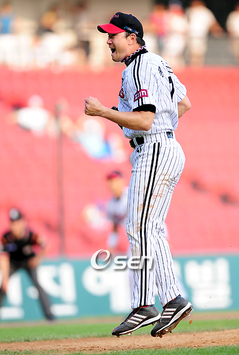 역시 1선발 다운 투구였다. LG 트윈스의 '봉타나' 봉중근이 노련한 투구를 선보이며 삼성 라이온즈 타선을 제압한 동시에 팀의 3연승을 주도했다. LG는 13일 잠실구장서 벌어진 2008 삼성 PAVV 프로야구 삼성전서 선발 봉중근의 7⅔이닝 무실점 호투와 1회 선제 결승타 포함 3안타 1타점을 기록한 외국인 타자 로베르토 페타지니의 활약에 힘입어 2-0으로 승리했다. LG는 이날 승리로 시즌 31승(57패, 13일 현재)째를 거두는 동시에 지난 6월 3일 이후 41일 만에 3연승 가도를 달렸다. 반면 삼성은 LG에 3연패 및 2경기 연속 영봉패를 당하며 지난 시즌까지 11년 연속 포스트시즌 진출에 성공한 전통의 강호답지 않은 모습을 보였다. 1선발의 호투 속에 LG는 순조롭게 선제점을 뽑아냈다. LG는 1회말 2사 2루서 로베르토 페타지니의 1타점 좌전 안타로 선취점을 올린 데 이어 4회 2사 1,3루서 김정민의 좌중간 1타점 적시타를 더하며 2-0을 만들어냈다. LG는 이 2점을 잘 지키며 삼성에 2경기 연속 영패의 굴욕을 안겼다. 삼성에게 기회가 없었던 것은 아니었다. 삼성은 0-1로 뒤지고 있던 2회 박석민의 좌중간 2루타 후 진갑용의 희생 번트로 1사 3루 찬스를 맞았으나 후속 타자 최형우와 김창희가 연속 범타로 물러나며 찬스를 날려버리는 등 타선 집중력이 결여된 모습을 보였다. 여기에 선발 윤성환은 다소 밋밋한 볼 끝으로 LG 타자들에 자주 커트당하는 공을 던지며 비교적 많은 투구수를 기록했다. 반면 LG 선발 봉중근은 압도적이지는 않았지만 노련한 투구로 7피안타(사사구 1개) 무실점을 기록하며 1선발 다운 모습을 보여줬다. 최고 146km에 이르는 직구 위주의 피칭을 선보이며 범타를 유도하는 과감한 모습을 보여줬고 삼성 타자들은 이를 적시타로 연결시키지 못하며 공격의 맥을 끊는 동시에 봉중근의 '수맥 피칭'을 도왔다. 또한 LG의 3루수 이종렬과 우익수 안치용은 8회초 연이은 호수비로 선발 봉중근의 승리를 지켜냈다. 올시즌 삼성을 상대로 4연승 행진을 이어가며 시즌 8승(5패)째를 기록한 봉중근은 이날 탈삼진 3개를 보태는 데 그쳤으나 탈삼진 부문 1위(103개) 자리를 그대로 지키는 데는 성공했다. 선제 결승타의 주인공 페타지니는 3타수 3안타(볼넷 1개) 1타점으로 6경기 연속안타 행진을 이어갔으며 안방마님 김정민 또한 3타수 3안타 1타점으로 공,수 양면서 만점 활약을 선보였다. 반면 삼성 선발 윤성환은 4이닝 6피안타 2실점으로 시즌 9패(6승)째를 떠안았다. 삼성은 4번 타자 박석민이 4타수 4안타로 정확한 타격을 선보였다는 점과 '불펜 쌍권총 듀오'의 한 축을 이루던 좌완 권혁이 3이닝 2피안타(탈삼진 3개) 무실점으로 호투했다는 데에 위안을 삼아야 했다. farinelli@osen.co.kr 13일 잠실 LG-삼성전 5회초 2사 1,2루서 강봉규를 삼진으로 잡으며 위기를 넘긴 봉중근이 제자리에서 펄쩍 뛰며 환호하고 있다./잠실=손용호 기자spjj@osen.co.kr
