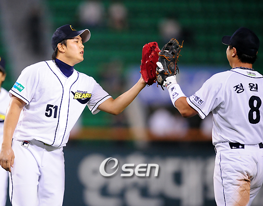 '2008 삼성 PAVV 프로야구' 두산 베어스와 SK 와이번스의 경기가 17일 잠실구장에서 벌어졌다. 이 날 두산은 선발 랜들의 6이닝 1실점 호투와 김현수의 2타점 역전 결승타에 힘입어 6-2로 승리를 거두며 SK 와이번스를 제압하는 동시에 9연승 가도를 달렸다. 경기를 마치고 세이브 투수가 된 두산 임태훈 투수와 정원석이 글러브로 하이파이브를 하고 있다./잠실=민경훈 기자 rumi@osen.co.kr