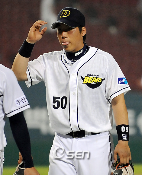 '2008 삼성 PAVV 프로야구' 두산 베어스와 SK 와이번스의 경기가 17일 잠실구장에서 벌어졌다. 이 날 두산은 선발 랜들의 6이닝 1실점 호투와 김현수의 2타점 역전 결승타에 힘입어 6-2로 승리를 거두며 SK 와이번스를 제압하는 동시에 9연승 가도를 달렸다. 경기를 마치고 역전 결승타의 주인공 두산 김현수가 덕아웃으로 들어서며 혀를 내밀고 있다./잠실=민경훈 기자 rumi@osen.co.kr