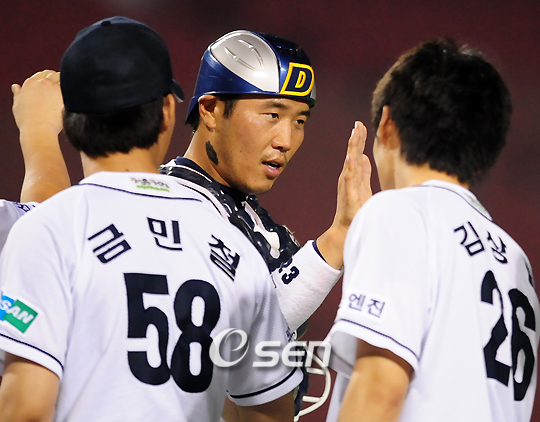 '2008 삼성 PAVV 프로야구' 두산 베어스와 SK 와이번스의 경기가 17일 잠실구장에서 벌어졌다. 이 날 두산은 선발 랜들의 6이닝 1실점 호투와 김현수의 2타점 역전 결승타에 힘입어 6-2로 승리를 거두며 SK 와이번스를 제압하는 동시에 9연승 가도를 달렸다. 경기를 마치고 8회말 2타점을 올린 두산 최승환 포수가 금민철, 김상현과 하이파이브를 하고 있다./잠실=민경훈 기자 rumi@osen.co.kr