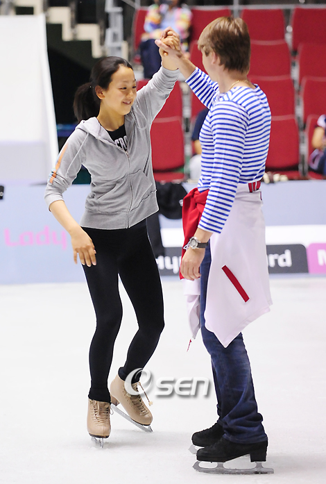 "열정적인 한국팬들의 응원을 다시 부탁드려요". 세계 정상급 남녀 피겨 스타들이 한여름 무더위를 날려버리기 위해 한 자리에 모였다. 여자 싱글 세계랭킹 1위이자 김연아의 동갑내기 라이벌 아사다 마오(18, 일본)를 비롯해 국내에 많은 팬을 보유한 예브게니 플루센코(26, 러시아)가 오는 19, 20일 양일간 잠실학생체육관 특설링크에서 열리는 현대카드 슈퍼매치 Ⅶ-08 '슈퍼스타스 온 아이스'를 위해 18일 한국을 찾았다. 마오는 "한국 방문이 두 번째다. 이번 쇼도 굉장히 기대하고 있다"고 아이스쇼를 앞두고 소감을 밝혔다. 역시 여자 싱글에서 우아한 연기를 선보이며 2007 ISU 세계 피겨선수권대회 우승을 차지, 안도 미키(21, 일본)도 한국 팬들을 만나기 위해 지난 17일 입국, 리허설에 참여했다. 남자 싱글에서는 2006 토리노 동계올림픽 금메달리스트 플루센코를 비롯해 2002 솔트레이크 시티 동계올림픽 금메달 알렉세이 야구딘(28, 러시아), 2006 토리노 동계올림픽 은메달 스테판 랑비엘(23, 스위스) 등이 무대에 오를 준비를 하고 있다. 특히 지난 2월 고양시에서 열린 4대륙대회서 한국팬들의 응원에 힘입어 준우승을 차지한 제프리 버틀(28, 캐나다)은 "스케이트을 타면서 그렇게 열정적인 응원은 처음 봤다. 또 한국에 오고 싶었다"며 다시 한 번 뜨거운 응원을 부탁한다고 말했다. 플루센코는 지난해 9월 목동 아이스링크 경기장에 불이 나면서 아이스쇼가 취소된 일을 기억하며 "올해는 불이 안 났으면 좋겠다"는 재치있는 대답으로 소감을 대신했다. 야구딘도 "지난해 불이 나서 아이스쇼를 못해 아쉬웠다. 이번에는 열광적인 한국팬들을 만나게 돼 기대된다"고 멋진 공연을 선보이겠다고 밝혔다. 한국 선수로서는 2008 4대륙선수권대회에서 4위를 차지하며 실력을 인정 받은 김나영(18, 연수여고)을 필두로 김민석(18, 불암고), 곽민정(15, 평촌중), 이동원(13, 경기과천초) 등이 출연한다. 김나영은 떨리는 목소리로 "이런 쇼와 기자회견이 처음이라 무척 떨린다. 세계적인 선수들과 함께 같은 무대에 서서 영광이다"며 열심히 해서 많이 배우겠다고 말했다. 이외에도 2008 전미선수권 남자 싱글 우승자 에반 라이사첵(23, 미국)과 아이스댄싱 벨빈-아고스토 커플 등도 무대를 밝힌다. 7rhdwn@osen.co.kr 아사다 마오와 알렉세이 야구딘이 커플댄스를 연습하고 있다./잠실학생체=민경훈 기자 rumi@osen.co.kr