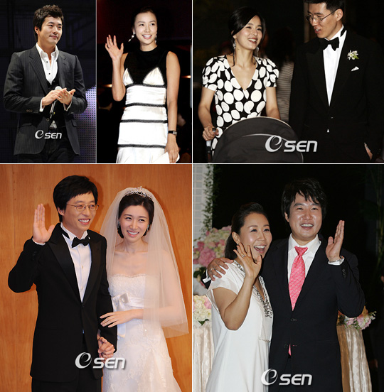 여기 또 한 명의 따끈한 스타커플이 탄생했다. 배우 권상우(32)와 미스코리아 출신 연기자 손태영(28)이다. 17일 열애설과 동시에 결혼설이 불거진 권상우는 18일 오후 9시 서울 프라자 호텔에서 직접 기자회견을 열고 자신의 입을 통해“9월 28일 손태영과 결혼식을 올린다”고 밝혔다. 올해 초 다른 동료 연예인들과의 저녁식사 자리에서 첫 만남을 가진 두 사람은 그 후 연인관계로 발전해 결혼을 약속했다. 두 사람 이 외에도‘결혼’에 골인한 연예인 스타 부부들을 짚어봤다. 유재석-나경은 부부 MBC ‘무한도전’을 계기로 사랑을 키워온 유재석과 나경은 아나운서는 그 후 각종 매체를 통해 서로의 애정을 확인해오다 지난 6월 4일 유재석이 결혼발표를 공식선언하며 공식커플로 인정받았다. 7월 6일 서울 장충동 신라호텔에서 열린 그들의 결혼식은 당시 1000여명의 유명스타들이 자리에 함께한 ‘축제의 장’이었다. 연정훈-한가인 부부 연예계의 대표적인 잉꼬 부부로 손꼽히는 연정훈, 한가인 부부가 있다. 지난 2003년 KBS 일일연속극 ‘노란 손수건’에서 커플로 출연한 것이 계기가 되어 2년간의 열애 기간을 가진 두 사람은 2005년 4월, 연정훈의 군 복무를 앞두고 세간의 많은 축복 속에 결혼식을 치렀다. 정혜영-션 부부 지난 2001년 션의 소속사인 YG패밀리 양현석의 대표의 소개로 만난 두 사람은 3년 동안 변함없는 사랑을 나눈 끝에 2004년 10월, 결혼에 골인했다. 두 사람의 사랑은 2000년 지누션의 콘서트에서 션이 공개프로포즈를 하면서 세간에 알려졌고, 지금까지도 연예계의 닮고 싶은 커플 1호로 꼽혀진다. 슬하에 1남 1녀를 두었다. 정선희-안재환 부부 두 사람은 지난해 방송 프로그램을 통해 만나 우정을 쌓아오다 올해 초 안재환이 정선희가 진행하는 라디오 프로그램 '정오의 희망곡'에 고정 게스트로 출연하면서 점차 연인 관계로 발전, 마침내 지난해 11월 17일 사랑의 결실을 맺었다 윤태영-임유진 부부 윤태영과 임유진은 지난 2003년 방송된 KBS2 TV '저 푸른 초원위에‘에서 친 남매로 인연을 맺은 뒤 절친한 선후배 사이로 지내오다 지난 2005년 결혼을 전제로 본격 교제를 시작했다. 윤태영의 부친은 현 삼성전자 대표이사 부회장이자 현 한국공학한림원 회장을 맡고 있는 기업인 윤종용 씨로, 두 사람의 결혼은 연예계뿐만 아니라 재계에서도 큰 관심을 불러일으킨 바 있다. 지난해 2월 14일 장충동 신라호텔에서 결혼식을 올린 두 사람은 현재 슬하에 1녀를 두고 있다. 이 외에도 연예계 최고 스타 커플은 신성일-엄앵란, 유동근-전인화, 차인표-신애라, 최수종-하희라, 손지창-오연수, 김태욱-채시라, 이재룡-유호정 등이 거론된다. 모두 당대 최고의 남녀 톱스타들이 만나 많은 화제 속에 결혼식을 치루며 '스타부부'로 이름을 알렸다. 여기에 최근 주영훈-이윤미, 김승우-김남주, 유준상-홍은희, 추상미-이석준 커플 등이 스타부부의 맥을 이어가고 있다. 결혼식뿐만 아니라 세월이 지난 지금까지도 행복한 가정의 모습을 지키고 있는 이들, 바로 스타부부들이다. yu@osen.co.kr 왼쪽부터 시계 방향으로 권상우-손태영, 션-정혜영, 정선희-안재환, 유재석 나경은.