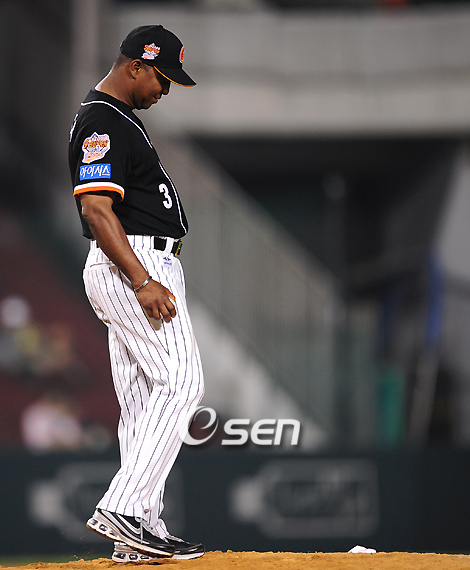 '2008 삼성 PAVV 프로야구' LG 트윈스와 롯데 자이언츠의 경기가 18일 잠실야구장에서 벌어져 LG가 8회말 나온 페타지니의 동점 투런홈런과 최동수의 역전 솔로홈런 두방으로 롯데에 4-3의 짜릿한 역전승을 거두었다. 8회말 홈런 두방으로 역전을 허용한 롯데의 로이스터 감독이 마운드에 올라와 망연자실한 표정으로 서있다./잠실=손용호 기자spjj@osen.co.kr