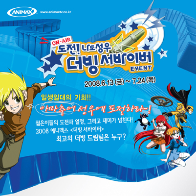 방송가는‘소 핫(so hot)’하고‘소 쿨(so cool)’한 여름 이벤트 가득하다. 여름방학을 앞두고 각 애니메이션 채널은 어린이부터 성인층까지 함께할 수 있는 특색있는 이벤트를 선보이고 있어 눈길을 끈다. 아마추어 성우가 되어 실제 성우를 만나보고 더빙도 경험할 수 있는 체험형 이벤트부터 동영상 공모전과 같이 전문성을 요하는 참여형 이벤트, 채널 홈페이지에서 몇 번의 클릭만으로 응모 가능한 응모형 이벤트까지 원하는대로 골라 참여할 수 있다. 특히 이번 여름 이벤트들은 애니메이션을 좋아하는 시청자는 물론, 일반인까지도 자신의 취미와 특기를 살려 응모할 수 있는 이벤트가 많아 참가자가 더욱 많을 것으로 예상된다. 애니맥스 마케팅팀 신경모 차장은 "특색있는 이벤트는 많은 시청자들에게 '더욱 가까운 채널'이라는 이미지를 심어줌과 동시에 참여하는 의미와 재미를 더할 수 있어 긍정적인 효과가 있다"며 “많은 사람들이 애니메이션에 관심을 가지고 즐길 수 있도록 하기 위해 이런 이벤트를 마련했다”고 밝혔다. ▲애니맥스, 아마추어 성우 컨테스트로 시청자 호기심 불러 스카이라이프 대표 애니메이션 채널 애니맥스는 여름방학을 맞이해 오는 9월 5일까지 약 3개월 간 아마추어 성우 컨테스트인 ‘도전! 나도 성우 더빙 서바이버’를 개최한다. 애니맥스는 이 이벤트를 통해 청소년을 비롯한 일반인들이 직접 더빙을 체험해보고 성우도 만나볼 수 있도록 한다. 2~4명의 인원으로 팀을 구성하고, 애니맥스 인기 작품인 지정작 7편 중 한 편을 선택해 UCC로 더빙 모습을 찍어 응모하면 그 중 5팀을 선발해 실제 성우들의 지도를 받고 애니맥스 방영작을 직접 더빙해 볼 수 있도록 했다. 다만 예선 접수가 24일에 마감되므로 서두르지 않으면 참여할 수 없다. 이벤트에 대한 자세한 사항은 애니맥스 홈페이지(www.animaxtv.co.kr)에서 확인할 수 있다. ▲닉, 방학맞은 어린이를 위한 3가지 빅 이벤트 준비 어린이 채널 닉(www.nick.co.kr)은 여름을 맞이해 18일부터 ‘썸머 슬러시 Big 3’ 페스티벌을 시행한다. 3가지 프로그램과 3가지 빅 이벤트, 그리고 3가지 대박 선물들로 이어지는 333 여름 프로젝트가 바로 그것. '아바타-아앙의 전설 시즌 2' 방영 기념으로 등장 인물의 고유 무술 동작을 미션으로 제시하고, 어린이들로 하여금 직접 동작을 따라 한 사진을 찍어 온라인에 올리도록 하는 이벤트, '티미의 못 말리는 수호 천사' 방영 기념 '코스모'와 '완다'의 이미지에 어린이들이 직접 촬영한 사진들을 넣어 조합해보는 '나만의 코스모 & 완다' 이벤트, '아이칼리 시사회' 등을 시행한다. ▲애니박스, 스테이션 ID 컨테스트로 디자인 솜씨 경쟁 극장판과 OVA 애니메이션을 주로 방영하는 애니박스(www.aniboxtv.com)는 개국 2주년을 맞이해 ‘애니박스 스테이션 ID 컨테스트’를 준비했다. 스테이션 ID란 방송국에서 광고와 함께 국명이나 콜 사인을 넣어 방영하는 것으로, 애니박스를 자유롭게 표현하면 된다. 15~20초 분량의 동영상(실사, 스톱 애니메이션, 2D 혹은 3D 애니메이션, 플래시 등)으로 제작하되, 작품 속에는 반드시 애니박스 로고를 삽입해야 한다. 마감은 8월 22일이고, 그 전에 우편으로 접수 가능하다. what@osen.co.kr 애니맥스 제공.