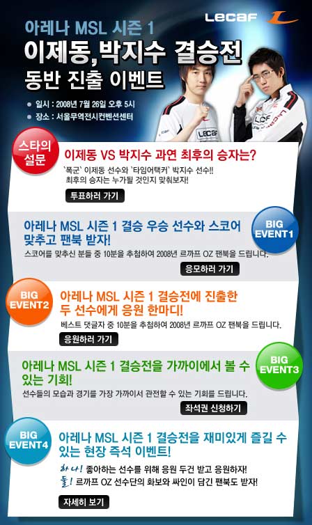 오는 26일 열리는 아레나 MSL 2008 결승은 한 마디로 르까프의 집안 잔치다. 이제동과 박지수의 결승 매치업이 열리기 때문. 90년생 동년배이고 연습실 내에서도 서로 옆자리에 앉아있는 만큼 서로에 대해 잘아는 사이지만 이번 결승을 준비로 자리를 옮기는 등 보이지 않는 심리전이 벌써부터 연습실내 긴장감을 고조시키고 있다. 두 선수의 자존심 대결을 앞둔 시점에 르까프는 결승전 주인공 두명을 모두 진출시킨 기념으로 홈페이지와 결승전 당일 현장에서 다양한 이벤트를 진행한다. 우선 홈페이지를 통해 23일부터 25일까지 ‘응원댓글’과 ‘승리선수와 스코어 맞추기’에 응모한 팬에게 추첨을 통해 경품을 증정하며, 선수별로 100명씩 홈페이지에서 선착순 신청을 받아 응원석 앞자리에서 응원할 수 있는 ‘좌석쿠폰’을 발행한다. 또 26일 결승전 당일에는 선착순 1,000명(이제동, 박지수 각 500명씩)에게 응원두건과 ‘2008 르까프OZ 팬북’ 200권을 무료로 나눠주는 이벤트를 진행한다. 르까프 프로게임단은 “르까프만의 응원문화를 만들어 가는 많은 팬들에게 감사의 뜻으로 다양한 이벤트를 준비했으며 프로리그 스토브기간동안 체육대회, 팬미팅 등을 통해 팬들에게 가깝게 다가갈 수 있도록 프로모션을 준비중이다”라고 밝혔다. 이제동, 박지수가 펼치는 결승전은 오는 26일 오후5시 서울 대치동 무역전시관(SETEC)에서 펼쳐질 예정이다. scrapper@osen.co.kr