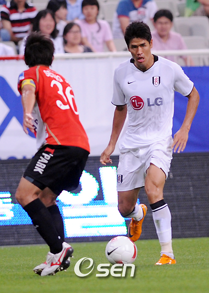 '무명' 최기석이 잉글랜드 프리미어리그 팀 골문에 득점포를 터트렸다. 부산은 23일 부산 아시아드주경기장에서 열린 'C1 초청 2008 풀햄 FC 코리아 투어' 1차전서 후반 12분 터진 최기석의 결승골에 힘입어 1-0 승리를 거두었다. 풀햄은 방한 첫 경기서 프리미어리그의 자존심을 구겼다. 지난 시즌 레딩에 골득실차에서 앞서 강등을 면하며 프리미어리그 잔류에 성공한 풀햄은 경기 초반부터 자모라, 판트실 그리고 테이무리안 등 새로운 선수들을 기용하며 선수들의 기량 점검에 나섰다. 오른쪽 측면 공격수로 나선 설기현은 선수들과 호흡이 맞지 않아 볼을 제대로 이어받지 못하며 선수들과 융합되지 못했다. 설기현은 전반 17분 부산 진영 오른쪽에서 올라온 크로스를 문전에서 헤딩 슈팅으로 연결했지만 골문 앞에서 기다리던 핑구에 걸려 기회를 살리지 못했다. 팽팽한 경기가 이어졌고 풀햄은 전반 막판 데이빗 힐리를 비롯해 주전 공격수들이 날카로운 중거리 슈팅을 시도했지만 득점없이 전반을 마쳤다. 후반서 풀햄은 지미 불러드와 에디 존슨 등을 투입해 프리미어리그의 본 모습을 보여주기 위해 노력했다. 하지만 승부의 균형을 깬 쪽은 부산이었다. 후반 12분 부산은 이승현이 풀햄 진영 오른쪽에서 올린 크로스를 최기석이 득점으로 연결하며 1-0으로 앞섰다. 선제골을 내주며 자존심을 구긴 풀햄은 잦은 선수 교체를 통해 만회골을 넣기 위해 노력했다. 하지만 기회는 쉽게 오지 않았고 오히려 부산의 한정화와 박희도에 돌파를 허용했다. 풀햄은 후반 32분 에디 존슨이 헤딩 슈팅을 시도했지만 부산 골키퍼 이범영의 선방에 막혔다. 또 설기현이 후반 35분 중거리 슈팅을 시도했지만 이범영이 막아내며 득점을 터트리지 못했다. 결국 풀햄은 부산의 저돌적인 플레이를 뚫지 못한 채 투어 첫 경기를 내주고 말았다. ■ 23일 전적 ▲ 부산 부산 아이파크 1 (0-0 1-0) 0 풀햄 FC 10bird@osen.co.kr 전반 풀햄 설기현이 드리블하며 패스할 곳을 찾고 있다./부산=윤민호 기자 ymh@osen.co.kr