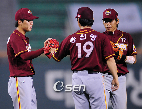 '2008 삼성 PAVV 프로야구' LG 트윈스와 우리 히어로즈의 경기가 23일 잠실구장에서 벌어졌다. 이 날 히어로즈는 23일 잠실구장서 벌어진 2008 삼성 PAVV 프로야구 LG전서 선발 마일영의 6⅓이닝 1실점 호투와 4회 대거 5점을 뽑아낸 타선의 집중력에 힘입어 5-1로 승리했다. 경기를 마치고 세이브 투수 송신영과 지석훈, 강정호가 하이파이브를 하고 있다./잠실=민경훈 기자 rumi@osen.co.kr