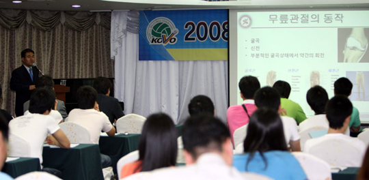 한국배구연맹(KOVO)이 의무 트레이너 국제 세미나를 개최했다. KOVO는 25일 방이동 올림픽파크텔 아테네홀에서 남녀구단 트레이너와 초,중,고 대학 일선 배구감독 등 50여명이 참석한 가운데 의무 트레이너 국제 세미나를 개최했다. 이번 세미나는 한국배구연맹 커미션닥터를 맡고 있는 윤강섭 박사(서울시립 보라매병원 부원장)의 주도 아래 배구 선수들의 상해예방과 재활을 목적으로 선진 사례교육을 통한 국내 트레이너의 질적 향상을 위해 올해 처음으로 개최되었다. 이날 행사에서는 일본 히로시마대학교 모치주키 유 박사의 '반복성 어깨 관절 탈구' 강의와 한국체육대학교 오재근 박사의 '배구선수의 무릎 손상에 대한 운동 재활 치료'강의가 있었다. 또 윤강섭 박사의 '슬관절(무릎) 손상 및 치료'에 대한 강의와 LIG손해보험 체력담당관을 맡고 있는 루카(이탈리아)의 '배구 선수에 대한 기초적인 트레이닝 방법론' 강의도 있었다. 한편 이번 행사는 토토 수익금의 지원으로 이뤄졌다. 7rhdwn@osen.co.kr 발표 중인 오재근 박사/한국배구연맹 제공.