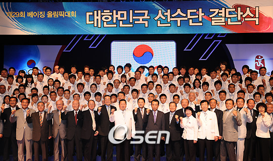 오는 8월 8일부터 24일까지 중국에서 개최되는 제29회 베이징올림픽대회에 참가하는 대한민국 선수단의 결단식이 25일 오후 올림픽공원 내 올림픽홀에서 열렸다. 김정행 선수단장을 비롯한 약 250여 명의 선수단과 한승수 국무총리와 유인촌 문화체육관광부 장관을 비롯한 내외귀빈이 참석한 가운데 파이팅을 외치며 선수단의 장도를 축하해주고 있다./올림픽공원=김영민 기자ajyoung@osen.co.kr