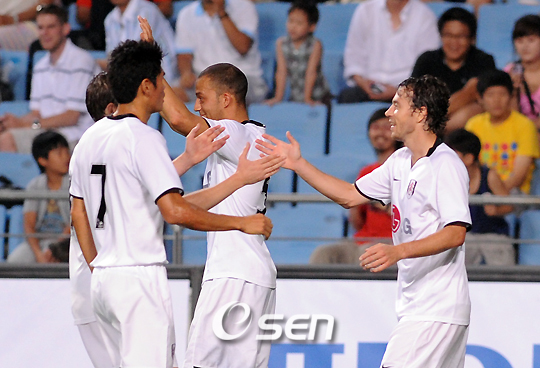 풀햄이 울산을 물리치고 체면치레를 했다. 풀햄은 26일 울산 문수 월드컵 경기장에서 열린 울산 현대와의 친선 경기에서 2-1로 역전승했다. 설기현은 후반 교체투입되어 45분을 누볐으나 공격포인트를 기록하지 못했다. 풀햄은 전반 초반 날카로운 모습을 보여주었다. 시작하자마자 날린 자모라의 슈팅이 골대를 맞고 나왔다. 이어 졸탄 게라의 슈팅도 터져나왔다. 여기에 에디 존슨의 슈팅마저 골대에 맞으면서 아쉬운 찬스를 놓쳤다. 울산은 패싱 플레이를 통해 경기를 풀어나갔고 전반 22분 첫 번째 찬스에서 골을 뽑아냈다. 왼쪽에서 현영민이 올린 크로스를 이진호가 페널티 에어리어에서 뛰어올라 헤딩슛, 골네트를 갈랐다. 이후 울산은 수비에 중점을 두었고 풀햄은 반격했지만 골을 뽑아내지는 못했다. 후반 들어 로이 호지슨 감독은 지미 불러드와 설기현을 투입시키며 분위기 반전을 노렸다. 특히 설기현은 자모라와 함께 최전방에 위치했다. 호지슨 감독의 노림수는 적중했다. 후반 12분 풀햄의 동점골이 터졌다. 지미 불러드가 하프라인 뒤에서 한번에 찔러주는 크로스패스를 사이먼 데이비스가 쇄도해 그대로 헤딩골로 연결한 것이다. 동점을 만든 풀햄은 자모라를 빼고 클린튼 뎀프시를 투입했다. 풀햄은 후반 27분 불러드의 패스를 받은 설기현이 좋은 찬스를 잡았다. 그러나 그의 슈팅은 골대를 넘기고 말았다. 이에 호지슨 감독은 데이빗 힐리까지 투입히키며 승리에 대한 열망을 드러냈다. 후반 34분 풀햄은 역전골을 만들어냈다. 설기현이 왼쪽에서 올린 긴 크로스를 졸탄 게라가 반대편에서 오른발 슈팅으로 연결했다. 게라의 슈팅은 크로스바를 때렸고 이것을 힐리가 헤딩슛으로 연결했다. 볼이 김영광 골키퍼의 몸을 맞고 나왔으나 다시 게라가 슈팅해 골을 만들어냈다. 이후 풀햄은 안드라닉 테이무리안이 좋은 찬스를 잡았으나 슈팅이 골대를 넘어가며 무산시킨 끝에 결국 2-1로 경기를 마쳤다. bbadagun@osen.co.kr 후반 사이먼 데이비스가 동점골을 넣고 동료들의 축하를 받고 있다./울산=윤민호 기자 ymh@osen.co.kr