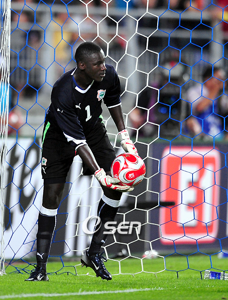 2008 베이징 올림픽을 앞두고 사상 첫 올림픽 메달을 노리는 올림픽대표축구팀이 27일 오후 8시 수원 월드컵경기장에서 코트디부아르와 평가전을 가졌다. 전반 골키퍼 정성룡의 롱킥이 원 바운드로 코트디부아르 골키퍼의 키를 넘어 골인되는 재미있는 일이 벌어졌다. 코트디부아르 골키퍼 앙방이 볼을 꺼내 하프라인 쪽으로 차고 있다./수원=손용호 기자spjj@osen.co.kr