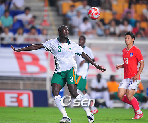 2008 베이징 올림픽을 앞두고 사상 첫 올림픽 메달을 노리는 올림픽대표축구팀이 27일 오후 8시 수원 월드컵경기장에서 코트디부아르와 평가전을 가졌다. 전반 골키퍼 정성룡의 롱킥이 원 바운드로 코트디부아르 골키퍼의 키를 넘어 들어가는 재미있는 일이 벌어졌다. 정성룡이 찬 볼을 코트디부아르 수비수가 골키퍼에게 잡으라고 사인하고 있다. /수원=손용호 기자spjj@osen.co.kr