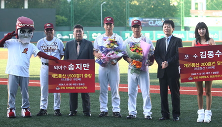 우리 히어로즈는 29일 오후 6시 30분 목동구장에서 열린 한화전에 앞서 포수 김동수(40)와 외야수 송지만(35)에 대한 특별시상식을 실시했다. 시상식은 한국야구위원회(KBO) 하일성 사무총장이 김동수와 송지만에게 각각 KBO 기념패를 전달했다. 또 히어로즈 이장석 대표이사는 두 선수에게 각각 기념패와 현금 300만원을 부상으로 전달했다. 김동수는 지난 15일 대구 삼성전에서 개인통산 200홈런을 쏘아올렸다. LG 소속이던 지난 1990년 5월 11일 대전 빙그레전에서 첫 홈런을 달성한 후 18년만에 거둔 프로통산 13번째 대기록이다. 송지만은 지난 12일 대전 한화전에서 개인통산 1500경기 출장(프로통산 16번째) 기록을 달성했다. 한화 유니폼을 입고 있던 1996년 4월 13일 사직 롯데전에서 데뷔전을 가진 송지만은 지난 2004년 6월 29일 잠실 두산전에서 1000경기 출장을 기록했다. letmeout@osen.co.kr 우리 히어로즈 제공.