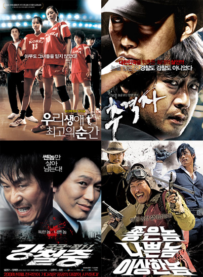 영화 ‘좋은 놈 나쁜 놈 이상한 놈’(이하 놈놈놈)이 개봉 11일만에 413만 관객을 동원했다. 이로서 ‘놈놈놈’은 올해 400만 관객을 동원한 4번째 한국영화가 됐다. 올해 400만 관객을 동원한 한국영화로는 38일 만에 400만 관객을 돌파한 ‘우리 생애 최고의 순간’(이하 우생순)이 있으며 31일 만에 넘어선 영화 ‘추격자’가 있다. ‘강철중: 공공의 적 1-1’(이하 강철중)은 25일만에 400만 관객을 돌파했다. 스포츠 드라마 ‘우생순’ 1월 10일 개봉한 ‘우생순’(임순례 감독, 전체 관람가)은 2004년 아테네 올림픽 결승전에서 명승부를 펼쳤던 여자핸드볼 국가대표팀의 감동 실화를 담았다. ‘우생순’은 스포츠와 여성 영화라는 장르적인 한계에도 불구하고 관객들에게 잔잔한 감동을 일으키며 흥행 몰이에 성공했다. 또한 당시 비주류스포츠 종목의 하나였던 핸드볼에 대한 국민적 관심을 불러일으키며 많은 박수를 받았다. 범죄 스릴러 ‘추격자’ 2월 14일 개봉한 ‘추격자’(18세 관람가)는 우리나라 관객들의 대중적인 취향과 거리가 있었던 스릴러라는 장르에 대한 관심과 애정을 높이는 계기가 됐다. 신예 나홍진 감독의 연출력과 김윤석 하정우 서영희 등의 연기내공이 조화를 이루며 웰메이드 스릴러물의 진수를 보여줬다. ‘추격자’는 올해 총 508만 명의 관객을 동원하며 상반기 흥행 1위의 자리에 올랐다. 또한 최근 열린 제45회 대종상영화제에서 최우수작품상을 비롯해 6관왕을 차지했다. 코믹 액션 ‘강철중’ 6월 19일 개봉한 코믹 액션 영화 ‘강철중’(15세 관람가)도 400만 관객을 돌파했다. 설경구는 한국영화 사상 유래를 찾기 힘든 꼴통 형사 캐릭터를 완성해 올 여름 더욱 강한 내공으로 돌아왔다. 또한 충무로의 재주꾼 장진 감독의 시나리오에 강우석 감독의 색깔이 덧입혀 그 매력을 더한다. 이제 우리나라 관객들에게는 할리우드의 슈퍼히어로가 아닌 우리 주변에 있을 법한 친숙한 꼴통 형사 강철중이 더 친근하게 다가온다. 한국형 웨스턴 무비 ‘놈놈놈’ 현재 여름 극장가를 가장 뜨겁게 달구고 있는 한국영화는 바로 7월 17일 개봉한 ‘놈놈놈’(15세 관람가)이다. ‘놈놈놈’은 개봉 1주일 만에 300만 관객을 넘어서더니 2주차에 400만 관객을 동원했다. 앞으로 ‘추격자’를 넘어서며 500만도 가뿐히 넘길 것으로 예상되고 있다. ‘놈놈놈’에 대한 평가는 극명하게 엇갈리지만 스타일리시한 화면과 놈들의 멋진 활약에 대해서는 이견이 없다. 내러티브가 없이 총소리만 난무한다는 혹평에도 정우성 송강호 이병헌의 질주가 계속될지 지켜볼 일이다. crystal@osen.co.kr . . . . .