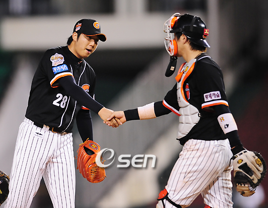 '2008 삼성 PAVV 프로야구' 두산 베어스와 롯데 자이언츠의 경기가 30일 잠실구장에서 벌어졌다. 이 날 경기에서 롯데는 5회 결승타 포함 2타점을 쓸어담은 김주찬과 9이닝 3실점으로 시즌 4번째 완투승을 거둔 선발 장원준의 활약에 힘입어 두산을 꺾고 9-3으로 승리를 거뒀다. 경기를 마치고 승리투수가 된 롯데 장원준과 강민호 포수가 악수를 하고 있다. /잠실=민경훈 기자 rumi@osen.co.kr