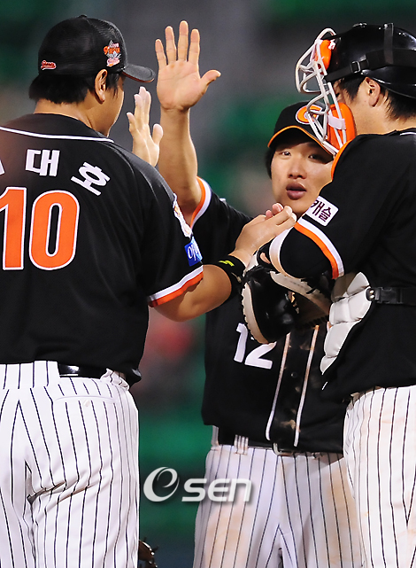 '2008 삼성 PAVV 프로야구' 두산 베어스와 롯데 자이언츠의 경기가 30일 잠실구장에서 벌어졌다. 이 날 경기에서 롯데는 5회 결승타 포함 2타점을 쓸어담은 김주찬과 9이닝 3실점으로 시즌 4번째 완투승을 거둔 선발 장원준의 활약에 힘입어 두산을 꺾고 9-3으로 승리를 거뒀다. 3회초 역전타를 날린 롯데 이대호와 5회전 재역전타를 날린 롯데 김주찬 하이파이브를 하려 하고 있다. /잠실=민경훈 기자 rumi@osen.co.kr