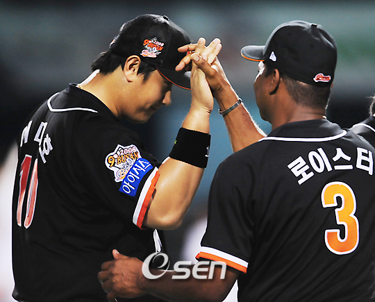 '2008 삼성 PAVV 프로야구' 두산 베어스와 롯데 자이언츠의 경기가 30일 잠실구장에서 벌어졌다. 이 날 경기에서 롯데는 5회 결승타 포함 2타점을 쓸어담은 김주찬과 9이닝 3실점으로 시즌 4번째 완투승을 거둔 선발 장원준의 활약에 힘입어 두산을 꺾고 9-3으로 승리를 거뒀다. 경기를 마치고 롯데 로이스터 감독과 이대호가 하이파이브를 하고 있다./잠실=민경훈 기자 rumi@osen.co.kr