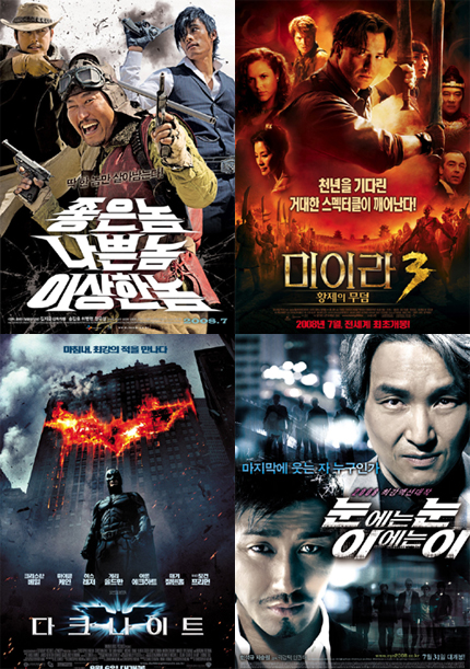 3년 내리 이어지던 여름철 한국영화 초강세 전선에 이상기류가 포착되고 있다. 세계 시장을 누비는 할리우드 블록버스터의 강력 태클이 원인이다. 과연 한국영화의 여름 시장 수성은 가능할까? 출발은 산뜻했다. 17일 막을 올린 170억 제작비의 김치 웨스턴 '좋은 놈, 나쁜 놈, 이상한 놈'이 개봉 2주째 400만 관객을 돌파하며 기세를 올렸다. 이어서 이준익 감독의 신작 '님은 먼 곳에'가 한 주 뒤인 24일 개봉, 지난해에 이어 한국영화 여름철 쌍끌이를 시작했다. 그러나 기쁨도 잠시. 할리우드의 올 여름 반격은 매섭기 그지없다. 매년 4월~7월초까지 한국 극장가를 주름잡다가 한여름 불볕더위에 쉬어가더니 올해는 '미이라 3'와 '다크 나이트'를 한국 관객들에게 내놓았다. 시리즈 1, 2편이 깜짝 흥행을 기록했던 '미이라 3'는 무대를 중국으로 옮겨 더욱 커진 규모와 화려한 볼거리를 자랑하고 있다. '배트맨 시리즈'의 연장 선상에 있는 '다크 나이트'도 미국 개봉에서 역대 10일 오프닝 흥행 신기록을 세울 정도로 돌풍을 일으키는 중이다. 크리스찬 베일이 배트맨 역을 맡았고 약물 중독으로 요절한 히스 레저가 악당 조커 역으로 신들린 듯한 열연을 펼쳤다. 30일 오후 기준 한국영화진흥회의 예매율 집계에 따르면 '미이라 3'가 31.8%로 1위를 달리는 가운데 '놈놈놈'이 22.1%로 2위, '님은 먼 곳에' 11.2%, '다크 나이트' 10.8%의 4강 체제를 이루고 있다. '미이라 3'와 '다크 나이트'의 등장은 1000만명 관객을 노리고 있는 '놈놈놈'이 봤을 때 껄끄럽기 그지없다. 현재 개봉 3주차에도 825개 스크린을 유지하고 있지만 예매 상황 등을 봤을 때 상당한 스크린 감소가 예상되기 때문이다. 597개 스크린으로 출발한 '님은 먼 곳에' 역시 '놈놈놈'과의 쌍끌이 효과를 제대로 누려보지도 못하고 치열한 4강 구도에 들어갈 판국이다. 한국영화의 폭발적인 여름 장세는 2006년 봉준호 감독의 '괴물'로 물꼬를 텄다. '괴물'은 그 해 여름, 무려 1300만명 관객을 불러모으며 한국영화 최다관객 신기록을 세웠다. 이어 지난해에는 심형래 감독의 '디워'와 광주민주화 운동을 다룬 '화려한 휴가'가 앞서거니 뒷서거니 흥행 몰이에 나서며 각각 800만명, 700만명으로 대박을 터뜨렸다. 그렇다면 다가올 8월의 흥행 구도는 어떤 식으로 전개될까. 예매율에서 보여지듯이 '다크 나이트' 보다는 '미이라 3'가 한국영화 두 편과의 전면전에서 선봉장으로 나설 전망이다. 그동안 한국 관객들은 할리우드의 슈퍼 히어로 영화들 가운데 어두운 분위기의 '배트맨' 등에는 별다른 호응을 보이지않은 반면, '미이라' 류의 시원하고 단순한 SF액션에 더 큰 애정을 쏟았다. 한국영화로는 젊은 층의 호응도가 센 '놈놈놈'이 초반 기세를 몰아 올드팬들에게 친숙할 내용의 '님은 먼 곳에'를 앞서고 있다. '놈놈놈'은 그동안 한국영화에서 찾기 힘들었던 스피디한 화면 전개와 웨스턴 액션으로 볼거리를 제공한다. 따라서 '놈놈놈' '미이라 3'가 앞서가는 가운데 '님은 먼 곳에' '다크 나이트'가 맹추격하는 그림이 될 가능성이 높다. 결국 최종 승부는 관객들의 입소문이 어떻게 도는 지 여부로 결정되겠지만 불황의 늪에 빠져 허우적거리던 국내 극장가는 모처럼 여름철 특수를 만끽할 것으로 보인다. mcgwire@osen.co.kr . . . . .