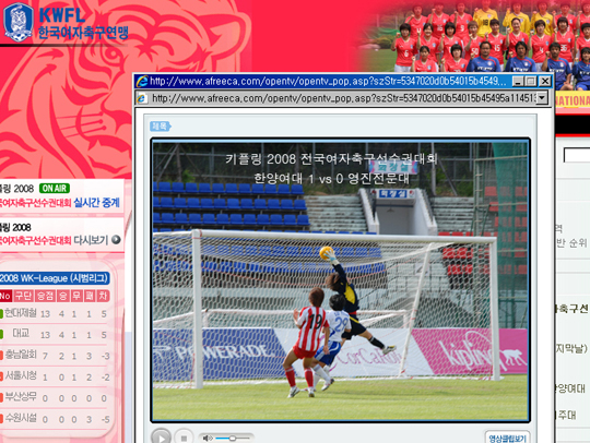 한국여자축구연맹이 인터넷생중계로 또 한 번의 가능성을 선보였다. 한국여자축구연맹(KWFL)은 지난 7월 18일부터 31일까지 경남 합천에서 열린 ‘키플링 2008 전국여자축구선수권’에서 여자축구 사상 인터넷생중계를 실시해 많은 여자축구팬들의 이목을 집중시킨 바 있다. 대회기간 중 총 28명기(62시간 중계)에 6,186명(경기당 평균 220명)이 몰린 이번 인터넷생중계는 경기당 300명으로 서버가 제한됐을 뿐만 아니라 사전홍보가 되지 않았다는 점을 고려하면 고무적인 성과다. KWFL은 부산예술영상고와 아프리카 TV에서 각각 영상촬영인력과 서버를 지원받아 이번 인터넷생중계를 구현했다. 여자축구연맹은 초등부부터 일반부까지 다양하게 인터넷 중계를 편성해 학부모는 물론 여자축구팬이 골고루 경기를 관람할 수 있게 했다. 반응도 좋았다. 여자축구팬을 자처하는 이미희씨는 “합천이 멀어서 경기를 보기 힘들었는데 인터넷으로 볼 수 있어서 너무 좋았다”며 “앞으로 화질만 좀 더 보완되면 더 많은 경기를 인터넷으로 보고 싶다”는 소감을 한국여자축구연맹 홈페이지에 남겼다. 이에 이의수 KWFL 회장은 “인터넷 중계를 보다 강화해 보다 많은 여자축구팬들이 경기장에 오지 못하더라도 경기를 관람할 수 있도록 지원하겠다”고 화답했다. KWFL은 오는 9월 18일 강원도 화천에서 개막하는 추계연맹전을 시작으로 내년 개막하는 최초의 여자축구리그 ‘Beautiful Football 2009 WK리그’까지 확대하는 방안을 고려 중이다. stylelomo@osen.co.kr 한국여자축구연맹 인터넷 중계 화면.