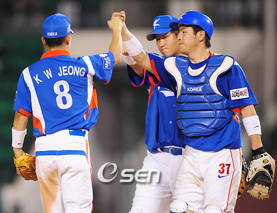 한국 올림픽야구대표팀이 2008 베이징 올림픽을 앞두고 6일 오후 잠실구장에서 쿠바대표팀과 평가전을 가졌다. 이 날 열린 쿠바 대표팀과의 2차 평가전에서 선발 봉중근의 호투와 타선이 홈런 2개 포함 장단 17안타를 폭발시킨 끝에 15-3으로 대승을 거뒀다.경기를 마치고 정근우와 이대호 강민호가 하이파이브를 하며 기쁨을 나누고 있다./잠실=민경훈 기자 rumi@osen.co.kr