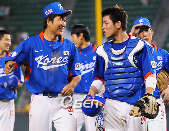 한국 올림픽야구대표팀이 2008 베이징 올림픽을 앞두고 6일 오후 잠실구장에서 쿠바대표팀과 평가전을 가졌다. 이 날 열린 쿠바 대표팀과의 2차 평가전에서 선발 봉중근의 호투와 타선이 홈런 2개 포함 장단 17안타를 폭발시킨 끝에 15-3으로 대승을 거뒀다. 경기를 마치고 이진영과 강민호가 환하게 웃으며 기쁨을 나누고 있다./잠실=민경훈 기자 rumi@osen.co.kr