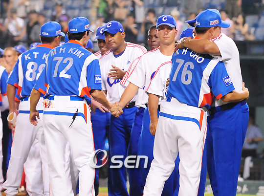 한국 올림픽야구대표팀이 2008 베이징 올림픽을 앞두고 6일 오후 잠실구장에서 쿠바대표팀과 평가전을 가졌다. 이 날 열린 쿠바 대표팀과의 2차 평가전에서 선발 봉중근의 호투와 타선이 홈런 2개 포함 장단 17안타를 폭발시킨 끝에 15-3으로 대승을 거뒀다. 경기를 마치고 한국과 쿠바의 선수 및 코치진들이 서로를 격려하고 있다./잠실=민경훈 기자 rumi@osen.co.kr