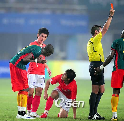 아쉬운 한 판이었다. 7일 벌어진 2008 베이징올림픽축구 D조 예선 카메룬의 경기서 한국은 후반 박주영의 프리킥으로 한 점을 앞서가다 후반 15분을 남겨놓고 카메룬에 동점골을 내주어 1-1로 아쉬운 무승부를 기록했다. 후반 카메룬 바닝이 이근호에게 심한 태클을 가해 퇴장당하자 카메룬의 한 선수가 이근호에게 "정말 태클에 다리를 밟혔냐" 며 애교있게(?) 항의하고 있다./친황다오=올림픽 취재반
