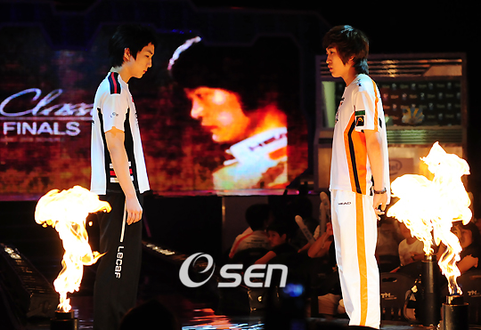'TG삼보-인텔 클래식 2008 시즌1' 결승전이 10일 저녁 서울 신도림 테크노마트 11층 특설무대에서 열렸다. 이 자리는 '파괴신' 이제동(18, 르까프), '최종병기' 이영호(16, KTF) 두 본좌 후보들이 서로의 자존심을 걸고 한판 대결을 벌였다. 르까프 이제동과 KTF 이영호가 무대 위에서 포즈를 취하고 있다./민경훈 기자 rumi@osen.co.kr