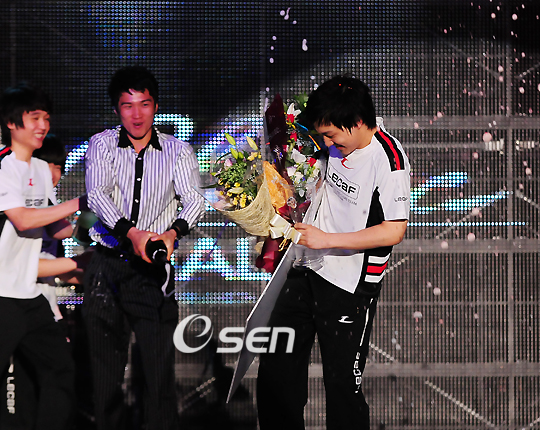 'TG삼보-인텔 클래식 2008 시즌1' 결승전이 10일 저녁 서울 신도림 테크노마트 11층 특설무대에서 열렸다. 이 자리는 '파괴신' 이제동(18, 르까프), '최종병기' 이영호(16, KTF) 두 본좌 후보들이 서로의 자존심을 걸고 한판 대결을 벌였다. 르까프 이제동이 KTF 이영호에게 3-0으로 압승을 거둔 후 이제동이 동료들에게 샴페인 세례를 받고 있다./민경훈 기자 rumi@osen.co.kr