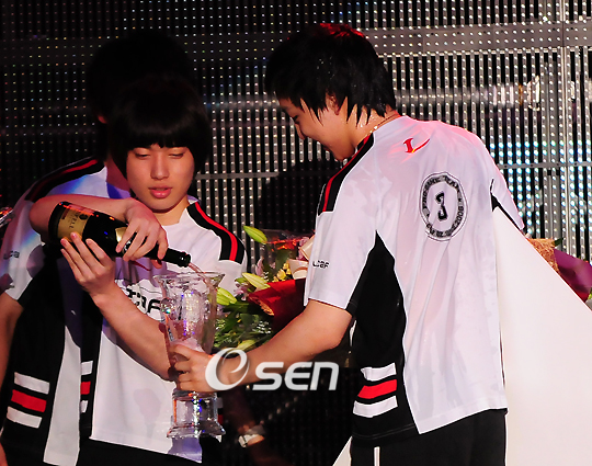 'TG삼보-인텔 클래식 2008 시즌1' 결승전이 10일 저녁 서울 신도림 테크노마트 11층 특설무대에서 열렸다. 이 자리는 '파괴신' 이제동(18, 르까프), '최종병기' 이영호(16, KTF) 두 본좌 후보들이 서로의 자존심을 걸고 한판 대결을 벌였다. 르까프 이제동이 이영호를 3-0으로 압승을 했고 이제동이 동료들로부터 샴페인을 우승트로피에 받고 있다./민경훈 기자 rumi@osen.co.kr