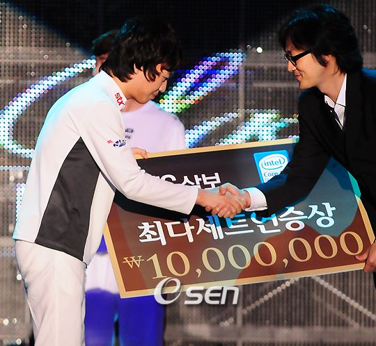 'TG삼보-인텔 클래식 2008 시즌1' 결승전이 10일 저녁 서울 신도림 테크노마트 11층 특설무대에서 열렸다. 이 자리는 '파괴신' 이제동(18, 르까프), '최종병기' 이영호(16, KTF) 두 본좌 후보들이 서로의 자존심을 걸고 한판 대결을 벌였다. 이 날 경기에서 르까프 이제동이 KTF 이영호에게 3-0으로 압승을 거두었다. 시상식에서 최다세트연승상을 STX 김윤중이 수상하고 있다./민경훈 기자 rumi@osen.co.kr