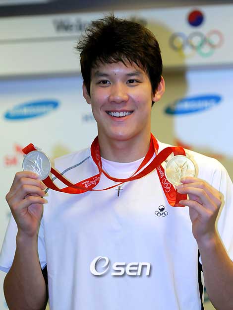 [OSEN=베이징, 올림픽취재반]"나보다 더 힘들었을 훈련 파트너들에게 고맙다". 수영에서 또 하나의 메달이 나왔다. '마린보이' 박태환(19, 단국대)이 아시아를 벗어나 세계로 뻗어나가는 계기를 마련했다. 박태환은 12일 오전 베이징 내셔널 아쿠아틱 센터에서 열린 2008 베이징올림픽 수영 남자 자유형 200m 결승전에서 2위로 골인, 은메달을 목에 걸었다. 지난 10일 400m 자유형에서 한국 수영사상 첫 금메달을 따낸 후 두 번째 메달이다. 특히 1분44초85의 성적으로 터치패드를 찍어 자신이 갖고 있던 아시아기록까지 경신하는 쾌거였고 아시아인 최초의 남자 자유형 200m 메달이다. 비록 2004 아테네올림픽 6관왕에 빛나는 '수영황제' 마이클 펠프스(미국)에 이번 대회 세 번째 금메달을 내줬지만 자신의 영역을 조금씩 넓혀가는 계기가 됐다. 이날 경기 후 왕푸징의 프라임호텔 내 코리아하우스에서 가진 박태환의 기자회견장에는 한국의 거의 모든 언론사가 모여들어 인산인해를 이뤘다. 이 자리에 활짝 웃으며 나타난 박태환은 시종 쑥스러워하면서도 자신감 넘치는 표정을 번갈아 보여줬다. 또 재미있는 유머와 위트까지 곁들인 박태환은 자신의 영광을 팀 동료들에게 돌리는 성숙함도 함께 내보였다. 박태환은 "지난 3월 열린 한라배에서 성적과 기록이 저조했지만 사실은 그 때부터 자신감이 있었다. 나 뿐 아니라 대표팀 모두 자신감을 가지고 최선을 다했다"면서 "나를 도와준 훈련 파트너들이 고생을 많이 했다. 감사하고 고맙다. 그렇기 때문에 금은동을 떠나 내 기록을 깰 수 있다는 자신감은 계속 가지고 있었다"고 말했다. 또 박태환은 어떤 훈련이 힘들었냐는 질문에도 "기본적인 훈련부터 테스트하는 훈련 모두 힘들었다"며 "200m 400m 기록을 맞춰 가는 게 힘들었는데 그 때마다 훈련 파트너들이 많이 도와줬다. 그들이 더 힘들었을 것"이라고 다시 한 번 팀 동료들에 감사의 뜻을 전했다. 박태환은 "수영장에 미국 국가가 먼저 울렸지만 400m 우승으로 두 번째로 애국가를 울린 것이 가장 영광스럽다"며 "펠프스는 스타트할 때 봤는데 정말 잘하더라. 올림픽이 끝나면 퀵 스타트에 주력할 생각이다. 잠영에서도 따라갈 실력은 아직 부족하지만 50%라도 따라갈 수 있을 때까지 최선의 노력을 다하겠다. 런던올림픽 이전에 붙을 기회가 있다면 좋은 기록을 올리고 싶다"고 겸손함과 승부욕을 동시에 내비쳤다. "나도 훈련을 하겠지만 펠프스도 하지 않겠냐"고 웃은 박태환이었지만 "내가 더 열심히 해서 어깨를 나란히 할 수 있도록 최선을 다하겠다"고 강조했다. 한편 박태환은 이날 이연택 대한올림픽위원회 위원장으로부터 금메달(5000만 원)과 은메달(2000만 원)에 대한 포상금을 받았다. 베이징=올림픽취재반