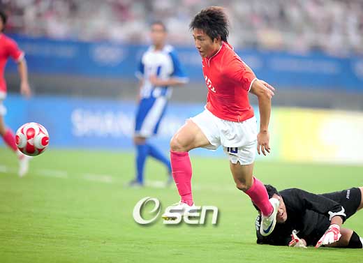 [OSEN=상하이, 올림픽취재반] 카메룬과 이탈리아가 비기면서 한국이 8강 진출에 실패했다. 한국은 좋은 경기 내용을 보이고도 다득점에 실패하며 답답한 90분을 보냈다. 올림픽 축구대표팀은 13일 상하이스타디움에서 열린 D조 3차전 온두라스와의 경기서 1-0으로 승리를 거뒀으나 1승 1무 1패, 승점 4점으로 조 3위에 머물러 8강 진출에 실패했다. 카메룬과 이탈리아는 득점없이 비기면서 승점 7점을 얻은 이탈리아가 조1위, 1승 2무(승점 5점) 카메룬이 조 2위로 8강에 진출했다. 이탈리아전에서 0-3으로 패하면서 이탈리아가 카메룬이 이긴다고 가정했을 때 다득점을 해야만 8강에 진출할 수 있었던 한국은 경기 초반부터 온두라스를 몰아붙였다. 하지만 많은 찬스에도 불구하고 골 결정력 부재로 다득점에 실패하며 박성화호는 유종의 미를 거두는 데도 실패했다. 발이 무거운 온두라스를 상대로 박주영과 김동진, 이청용은 동료들에게 많은 찬스를 만들어주며 경기 초반 경기를 쉽게 풀어나갔다. 다소 다득점에 대한 부담감으로 온두라스 한 선수가 볼을 잡으면 박성화호는 3~4명이 붙으면서 자신의 자리를 못 지키는 모습을 보이기도 했지만 이내 전열을 가다듬고 공격에 박차를 가했다. 분위기는 전반 22분 김동진의 오른발 중거리슛이 오른쪽 골문을 흔들면서 한국이 가져왔다. 첫 골을 터트린 한국은 온두라스 수비 뒷공간을 파고들며 추가골을 노렸으나 선수들의 움직임에는 부담감이 느껴졌다. 수 많은 찬스를 놓치면서 추가골은 쉽게 터지지 않았다. 후반 시작하자마자 한국은 박주영이 들어가는 조영철에게 찔러주는 패스를 했으나 조영철의 슛이 빗나가며 고개를 떨궜다. 박주영의 감각적인 패스는 살아났지만 그라운드에 막 들어온 조영철의 슈팅은 약했다. 이후 다시 박주영은 후반 16분 뒤로 돌아 들어가는 조영철을 보고 발꿈치로 재치있게 패스해줬지만 골키퍼와 1대1 찬스를 맞은 조영철의 슈팅은 골키퍼에 막혔다. 공격에서 수비로 넘어오는 속도가 느린 온두라스를 상대로 충분히 추가골을 넣을 수 있는 상황에서 골결정력이 모자라 한국은 힘든 경기를 펼쳤고 카메룬과 이탈리아가 비기면서 8강 진출은 물거품이 됐다. 카메룬의 경기 결과와 상관없이 무더위 속에서 시원한 골을 기대했던 팬들은 일방적인 경기 끝에 한 골만 넣은 박성화호에 씁쓸한 표정을 감출 수가 없었다. 후반 조영철이 온두라스 골키퍼를 제쳤으나 득점에 실패하고 있다./상하이=올림픽취재반
