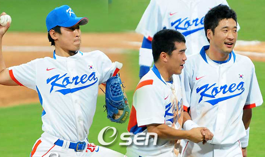 [OSEN=베이징, 올림픽취재반]'위기를 기회로 만들어라'. 2008 베이징올림픽 한국야구대표팀이 미국을 상대로 신명나는 첫 스타트를 끊을 수 있었던 것은 김경문 감독이 내보낸 조커들의 활약 때문이었다. 대표팀은 13일 우커송 제 2구장에서 열린 2008 베이징올림픽 예선 미국과의 부담스런 첫 대결을 8-7로 짜릿하게 뒤엎었다. 이종욱의 끝내기 중견수 희생플라이 때 3루주자 이택근이 홈으로 쇄도, 승부를 결정지었다. 무엇보다 김경문 감독이 믿고 내보낸 선수들이 한꺼번에 무너질 수 있었던 위기를 잘 극복했다. 그리고 단 한 번의 찬스를 놓치지 않은 덕분이다. 소속팀(KIA)에서는 선발로 활약하고 있는 우완 투수 윤석민은 적어도 이날은 그야말로 최고의 클로저였다. 6-4로 앞선 9회 1이닝을 마무리하기 위해 나선 한기주가 선두타자에게 홈런을 허용 6-5로 쫓겼고 계속해서 우전안타, 좌중간 2루타로 무사 2, 3루 위기에 몰리자 전격 투입됐다. 테리 티피에게 볼넷을 허용, 2사 만루에 몰린 후 매트 브라운에게 2타점 역전타를 맞긴 했다. 그러나 대량 실점으로 연결될 수 있었던 순간, 무사 2, 3루를 2사 2, 3루로 바꿔놓아 미국 타자들의 기세를 꺾어놓았다. 결국 1이닝 1피안타 1볼넷 2실점(한기주 책임)으로 막은 것은 9회말 역전의 발판이 됐다. 결국 승리투수로 이름을 올린 윤석민은 임태훈 대신 대표팀에 들어온 부담에서 완전히 해방되는 계기를 마련했다. 정근우는 절체절명의 순간에 역전을 부르는 선봉장이 됐다. 진갑용 대신 타석에 들어선 정근우는 제프 스티븐스로부터 좌익수 왼쪽에 떨어지는 2루타를 빼앗아냈다. 김현수의 2루 땅볼 때 3루까지 간 정근우는 이택근의 2루 땅볼 때 홈으로 파고들어 극적인 동점을 이뤄냈다. 이택근은 '택근브이'라는 별명처럼 정말로 승리를 불러왔다. 고영민 대신 대타로 나선 이택근은 정근우를 홈으로 불러들이는 내야 땅볼 후 스티븐스의 견제 악송구 때 지체없이 3루까지 내달려 미국 수비를 당황하게 만들었다. 결국 결승 득점을 올리며 환호했다. 이종욱의 중견수 플라이가 다소 짧은 느낌이었지만 과감하게 홈으로 뛰어들었다. 미국전 첫 승은 선발 라인업보다 더 빛난 조커들의 합작품이 빚어낸 하모니였다. letmeout@osen.co.kr 윤석민-정근우-이택근 . . . . .