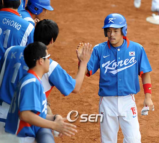 [OSEN=베이징, 올림픽 취재반] 김경문 감독이 이끄는 올림픽 대표팀이 난타전 끝에 대만을 꺾고 5연승으로 예선 2위를 확보, 4강 진출을 확정지었다. 대표팀은 18일 중국 베이징 우커송 야구장에서 열린 대만과의 대결에서 7회 강민호의 결승 적시타에 힘입어 9-8 승리를 거뒀다. 4강 진출은 확정지었지만 '마운드 불안'이라는 과제도 남겼다. 대표팀 타선은 1회부터 터졌다. '테이블 세터' 이종욱과 정근우가 빠른 발을 활용한 내야 안타로 무사 1,2루 찬스를 마련한 뒤 김현수가 외야 플라이로 물러났다. 그러나 4번 이승엽이 볼넷을 골라 만든 1사 만루서 이대호가 3-유간 빠지는 2타점 적시타로 불방망이쇼를 예고했다. 계속된 1사 2, 3루서 이진영의 2타점 적시타로 4-0으로 달아났다. 진갑용의 내야 땅볼 타구를 잡은 대만 유격수 린즈셩이 2루로 던졌으나 높게 송구하는 바람에 주자 모두 세이프. 8번 김민재가 헛스윙 삼진 아웃됐으나 본선 무대에서 무안타로 침묵했던 고영민이 좌중월 3점 아치를 쏘아 올리며 선발 양지앤푸를 강판시켰다. 2회 선두 타자 정근우가 중견수 뜬공으로 아웃된 뒤 김현수의 볼넷, 이승엽의 우전 안타로 1사 1, 2루 추가 득점 기회를 만들자 이대호가 두 번째 투수 니푸더를 상대로 좌측 펜스를 원바운드로 맞추는 1타점 2루타를 터트렸다. 그러나 대만의 반격도 만만치 않았다. 2회 1사 1, 3루서 린즈셩의 투수 앞 땅볼 때 3루 주자를 태그 아웃 시켰지만 계속된 2사 1, 2루서 이에쥔장 타석 때 폭투로 주자 모두 한 베이스씩 진루했다. 이에쥔장의 1타점 우전 안타와 수비 실책으로 2점을 만회했다. 대만은 2-8로 뒤진 5회말 공격 때 4점을 보태 6-8 턱밑 추격했다. 1사 후 로어구어후이의 볼넷, 펑정민의 좌중간 안타, 스즈웨이의 볼넷으로 만루 찬스를 만들었다. 지앙즈시앤의 2타점 중전 적시타와 린즈셩의 1타점 적시타로 3점을 만회했다. 이어 이에쥔장의 중견수 희생 플라이로 2점차로 추격했다. 기세 오른 대만 타선은 6회 8-8 승부를 원점으로 되돌렸다. 1사 1, 2루서 전 타석까지 3안타를 때린 펑정민이 주자 일소 2타점 우전 안타로 승부를 원점으로 되돌렸다. 그러나 후속 타자 스즈웨이와 지앙즈시앤이 각각 1루수 파울 플라이와 스트라이크 낫아웃에 그쳤다. 8-8로 팽팽하게 맞선 대표팀의 7회초 공격. 선두 타자 이대호가 볼넷으로 나가자 대표팀 벤치는 대주자 이용규를 투입했다. 이어 이진영이 3-유간을 빠지는 안타로 만든 무사 1,2루 역전 찬스를 만들었다. 타석에는 1회 진갑용 대신 포수 마스크를 쓴 강민호. 한 방이 간절했던 순간 강민호는 깨끗한 중전 적시타를 터트리며 2루 주자 이용규를 홈으로 불러 들여 9-8로 전세를 뒤집었다. 대표팀은 7회 강민호의 1타점 역전타로 9-8 승기를 되찾자 선발 봉중근-한기주에 이어 권혁-윤석민을 투입, 승리를 지켰다. . . . . . 2008베이징올림픽 야구 예선 한국-대만 경기가 18일 우커송 야구장에서 열렸다. 한국 7회초 무사 1,2루 강민호의 적시타 때 이용규가 득점을 올리고 동료들의 축하를 받고 있다./베이징=올림픽취재반