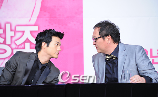KBS 2TV 월화드라마 '연애결혼' 제작발표회가 19일 오후 서울 여의도 63빌딩 코스모스 홀에서 열렸다. 이 드라마는 인연을 엮는 직업인 재혼 전문 커플 매니저 이강현(김민희 분)과 인연을 끊는 직업인 이혼 전문 변호사 박현수(김지훈)의 직업 이야기를 통해 진정한 사랑과 결혼의 의미를 찾아가는 이야기로 오는 25일 첫 방송 예정이다. 기자회견 중 김지훈과 박상면이 얘기를 나누고 있다./민경훈 기자 rumi@osen.co.kr