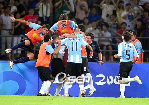 [OSEN=베이징, 올림픽취재반] 아르헨티나가 브라질을 물리치고 2008 베이징 올리픽 남자축구 결승전에 진출했다. 아르헨티나는 19일 밤 베이징 워커스 스타디움에서 열린 브라질과의 준결승전에서 세르히오 아게로의 2골과 후안 로만 리켈메의 추가골로 3-0 완승을 거두었다. 전반은 팽팽했다. 양 팀 모두 경기의 흐름을 주거니받거니 했다. 브라질은 호나우디뉴, 아르헨티나는 리오넬 메시를 앞세워 공격을 풀어나갔지만 골을 만들어내지는 못했다. 전반 40분 메시가 브라질 수비수를 제치고 슈팅을 했지만 빗나갔고 2분 후 브라질 헤르나네스의 슛 역시 골문을 빗나갔다. 아르헨티나의 골폭풍은 후반에 몰아쳤다. 아르헨티나는 후반 초반 브라질의 공격수 라파엘 소비스의 연이은 슈팅을 막아낸 후 경기 흐름을 가져왔다. 후반 7분 왼쪽에서 앙헬 디마리아의 크로스를 받은 아게로가 가슴으로 밀어넣으며 첫 골을 만들었다. 그로부터 5분 후 아르헨티나의 두 번째 골이 터졌다. 메시가 내준 패스가 오른쪽으로 갔고 여기서 크로스가 올라간 것. 이것을 아게로가 다시 골로 연결시키며 2-0으로 앞서나갔다. 0-2가 되자 둥가 브라질 감독은 파투를 투입시켰으나 골을 만들어내지 못했다. 후반 30분 호나우디뉴의 프리킥이 골대를 맞고 나왔고 이것을 파투가 차넣었지만 오프사이드로 판정됐다. 브라질로서는 제일 아쉬운 장면. 위기를 넘긴 아르헨티나는 세 번째 골을 기록했다. 후반 29분 아게로가 페널티킥을 얻어냈고 이것을 리켈메가 성공시킨 것이다. 0-3으로 뒤지자 브라질의 선수들은 경기를 포기했고 후반 막판 루카스와 티아구 네베스가 퇴장당하는 좋지 않은 모습을 보이며 무너지고 말았다. 한편 앞서 상하이에서 열린 준결승전에서는 나이지리아가 벨기에를 4-1로 눌렀다. 이로써 2008 베이징 올림픽 결승은 오는 23일 올림픽 주경기장에서 아르헨티나와 나이지리아가 맞붙게 되었다.