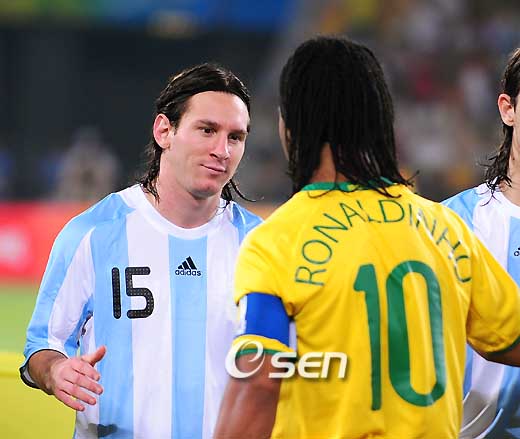 [OSEN=베이징, 올림픽취재반] 어제의 동료가 적이 되어 펼친 맞대결은 젊은 메시의 승리였다. 19일 밤 베이징 워커스 스타디움에서 열린 아르헨티나와 브라질의 남자 축구 준결승전은 한솥밥을 먹었었던 리오넬 메시(21, FC 바르셀로나)와 호나우디뉴(28, AC 밀란)의 대결로 관심을 끌었다. 둘은 FC 바르셀로나에서 함께 뛰어 맞대결을 펼칠 기회가 별로 없었다. 물론 월드컵 예선에서 만나기는 했지만 양국의 축구 스타가 총출동하는 만큼 둘만의 대결이 아닌 성격이 달랐다. 하지만 23세 이하 선수들이 주축이 되는 올림픽에서 대결은 명실상부한 메시와 호나우디뉴의 맞대결이었다. 전반은 비슷했다. 메시는 특유의 전진 드리블을 앞세워 브라질을 공략했다. 호나우디뉴 역시 화려한 개인기와 넒은 시야를 바탕으로한 패스로 팀 공격을 이끌었다. 둘의 팽팽한 모습을 반영이나 하듯 양 팀은 전반 내내 용호상박이었다. 그러나 후반 들어 아르헨티나쪽으로 무게중심이 급격히 기울어졌다. 무엇보다도 후반부터 호나우디뉴의 페이스가 떨어진 것이다. 호나우디뉴가 부진하자 브라질의 공격은 무뎌졌다. 반면 메시는 후반부터 팀 동료들을 적극 활용하며 자신에게 집중된 수비를 따돌렸다. 아게로가 넣은 두 골에 메시가 모두 직간접적으로 관여하면서 팀의 3-0 승리를 이끌었다. 브라질의 호나우디뉴와 아르헨티나의 메시가 경기 전 인사를 나누고 있다./베이징=올림픽취재반