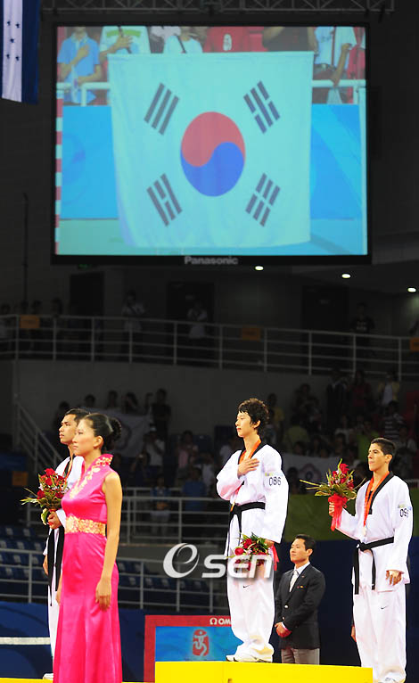 [OSEN=베이징, 올림픽취재반] 한국이 금메달 10개를 획득해 베이징올림픽 목표를 달성했다. 한국 선수단은 21일 태권도에서 두 개의 금메달을 따내며 이번 대회 목표였던 금메달 10개를 폐막을 사흘 앞두고 달성했다. 대회 첫날이던 지난 9일 새로운 한판승의 사나이로 등극한 남자 유도 60kg급 최민호를 시작으로 둘째날 박성현-윤옥희-주현정의 여자 양궁 단체전, '마린보이' 박태환의 수영 자유형 400m서 한국의 금메달 행진은 시작됐다. 11일에는 남자 양궁 단체전에서 박경모-이창환-임동현이 4번째 금메달을 선사했고 12일에는 10m 공기권총에서 은메달에 그쳤던 진종오가 50m 권총에서 정상에 올랐다. 13일에는 남자 역도 77kg 사재혁이 깜짝 금메달을 선사해줬고 한동안 금메달이 뜸한 뒤 16일에 여자 역도 +75kg급 장미란이 인상, 용상, 합계 세계신기록을 모두 갈아치우며 금메달을 들어올렸다. 한국 역도가 효자종목으로 떠오르는 순간이다. 17일에는 배드민턴 혼합복식서 새로운 국민 남동생으로 떠오른 이용대가 여자복식 은메달의 이효정과 한 조를 이뤄 8번째 금메달을 획득했다. 그리고 한국이 종주국인 태권도서 21일 여자 57kg급 임수정과 남자 68kg급에서 손태진이 금메달 두 개를 추가해 10개를 채웠다. 하지만 금메달 10개가 끝이 아니다. 한국은 예선 전승으로 준결승에 진출한 야구를 비롯해 22일 여자 태권도 67kg급 황경선과 23일 남자 80kg이상급 차동민이 금메달을 노려 목표 초과 달성을 노린다. 10번째 금메달을 차지한 손태진의 시상식.